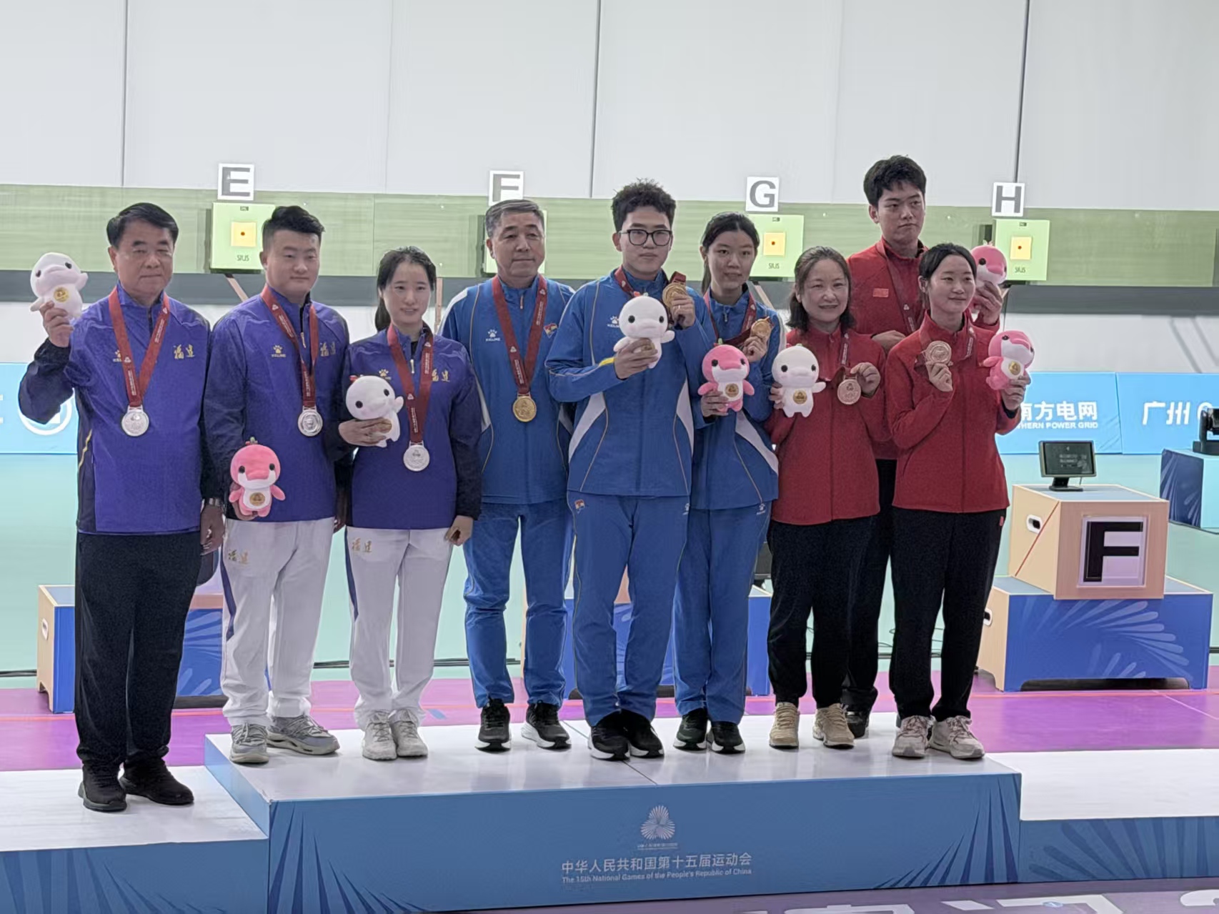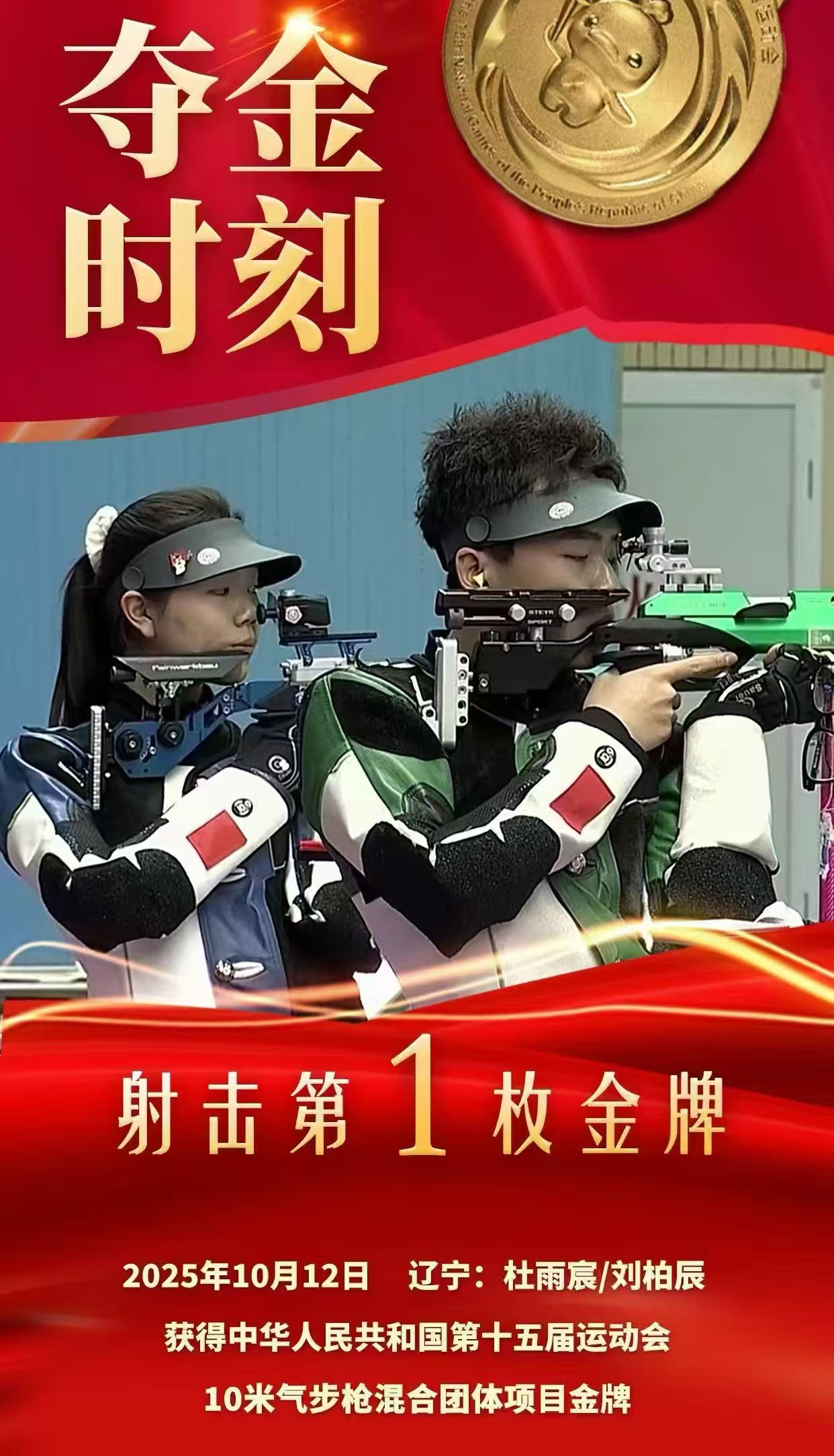 10月12日,中华人民共和国第十五届运动会射击项目在广州市广东射击馆产生首金!辽宁组合杜雨宸/刘柏辰稳扎稳打,一路战胜5位奥运冠军选手,勇夺10米气步枪混合团体项目金牌!这是辽宁射击队时隔16年再夺全运会金牌!